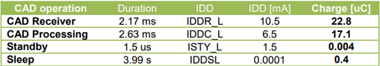 這產生大約 40.4 uC 的總電荷消耗,相當於 10 uA 的平均電流(上圖的紅線),然後將此消耗添加到配套 MCU 的電荷或電流消耗中,以確定吸收單元的總消耗。