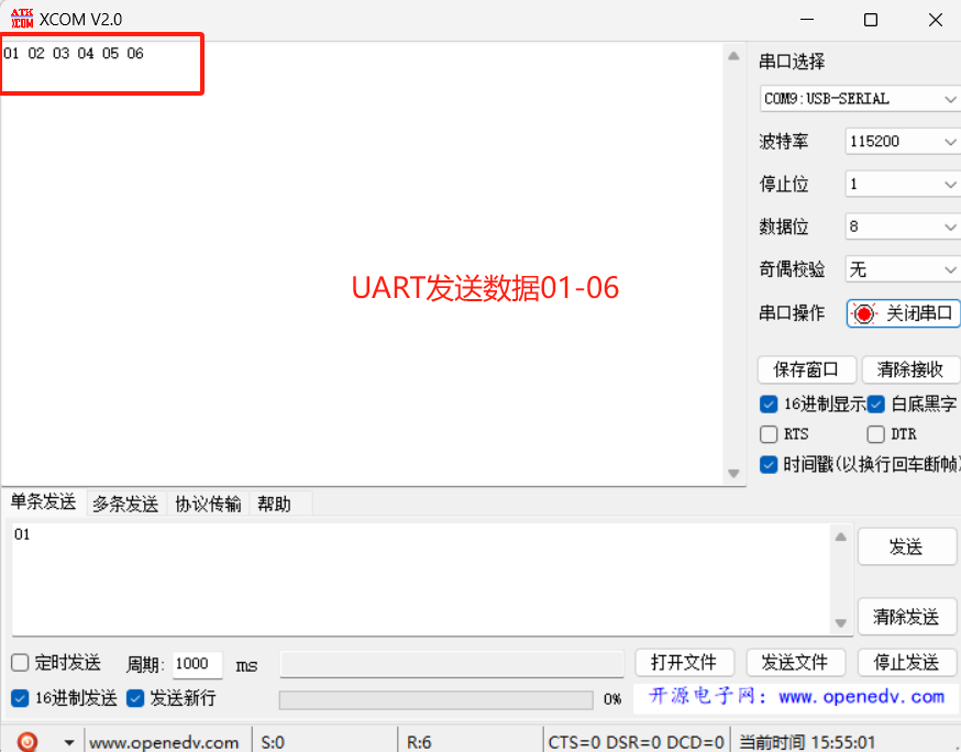 - main 函數:程序對 UART 進行了初始化,發送數據 01-06。