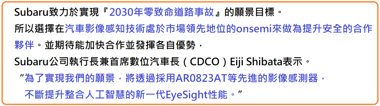 onsemi宣布,將成為Subaru未來車型新一代EyeSight立體攝影機前方感知系統影像感測器的主要供應商。
