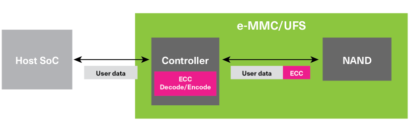 - eMMC控制器從 NAND 閃存記憶體中讀取用戶數據及其對應的 ECC。