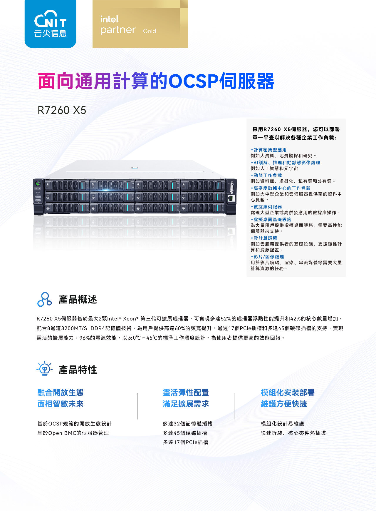 目前,基於OCSP規範的R7260 X5(西子湖)2U通用型伺服器可滿足不同行業的多種細分應用場景需求: