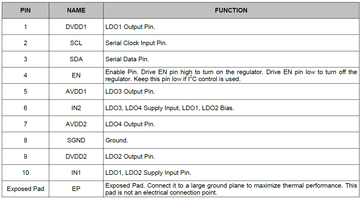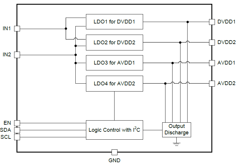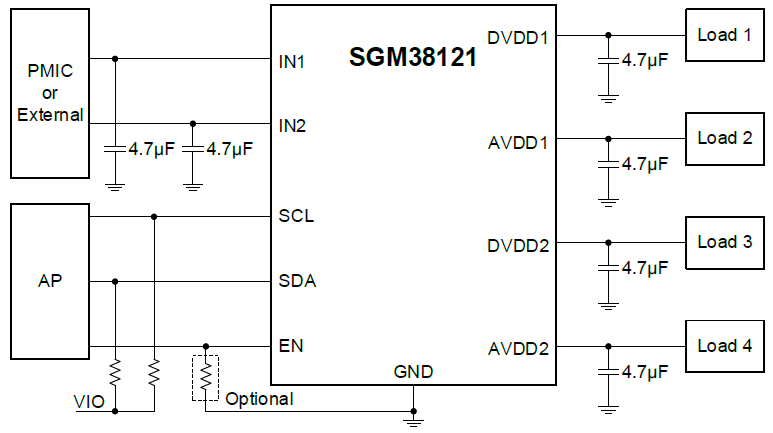 SGM38121 是一款 4 通道 LDO PMIC,具有兩個高效低輸出 DVDD 通道和兩個高 PSRR 低噪聲 AVDD 通道