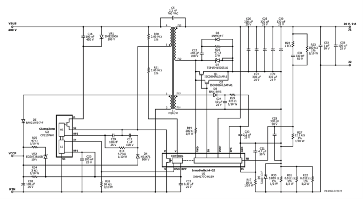 輸出電壓保護利用主變壓器上的偏置繞組將電流驅動到 InnoSwitch4-CZ IC 的主旁路引腳。偏置繞組輸出電壓跟踪電源輸出電壓。連接在偏置繞組輸出和主旁路引腳之間的齊納二極體可以可靠地檢測到次級過壓故障,並根據所選的故障響應類型使主控制器鎖存關閉或進入自動重啟。