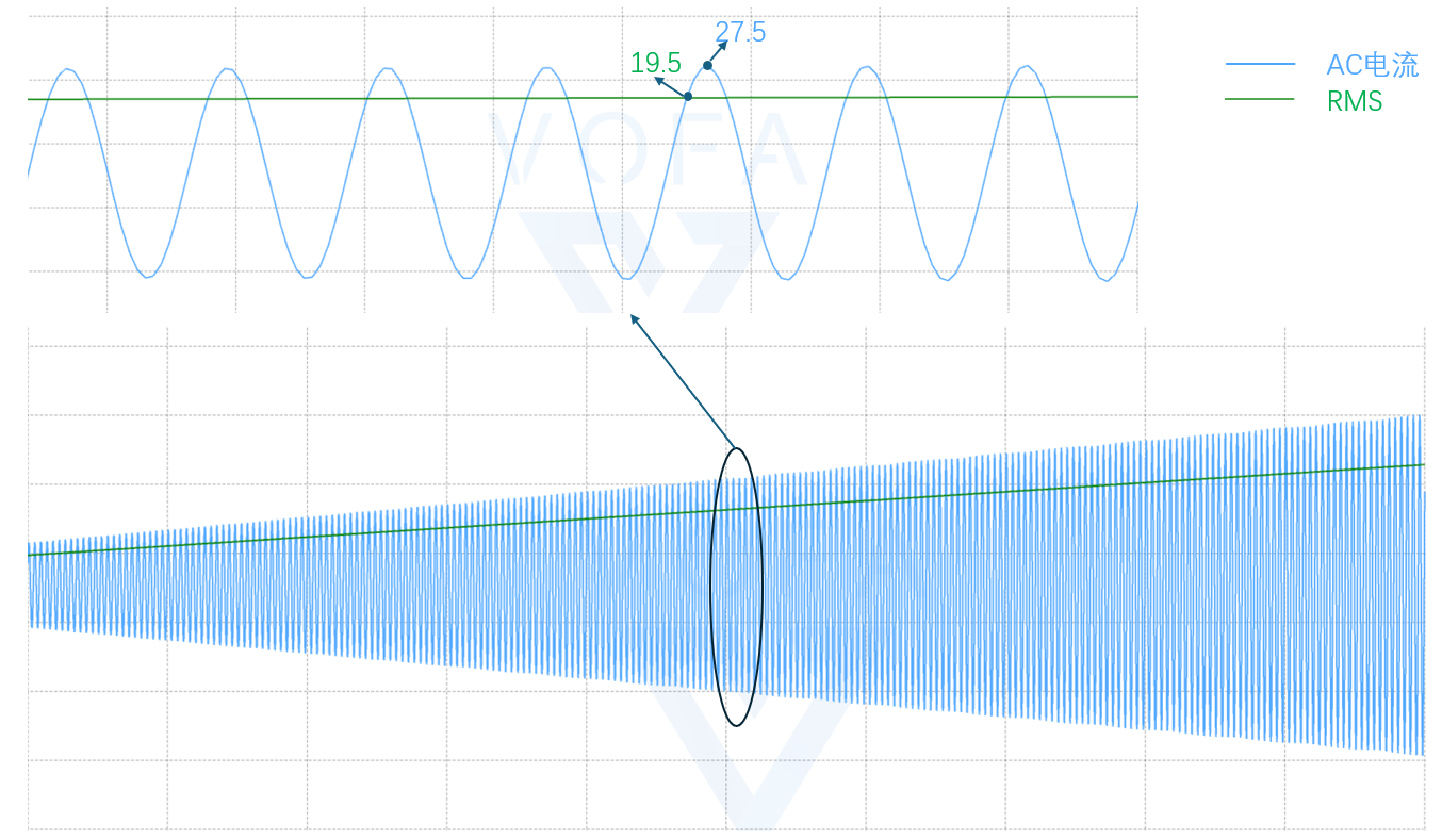 圖中的藍色曲線代表了交流(AC)電流的波形,綠色直線表示計算得到的AC電流的均方根(RMS)值,從圖中可以看出,RMS值在交流電流的一個周期內保持相對穩定,這表明計算方法能夠準確捕捉到AC電流的有效值。圖中標註了AC電流的峰值,分別為19.5和27.5。RMS值與最大峰值保持根號2倍的關係。從圖中RMS值與AC電流波形的跟隨程度來看,遞歸算法在計算RMS值時表現出了良好的準確性和穩定性。這意味著算法能夠有效地處理實時數據,並為PFC應用提供可靠的電流有效值。