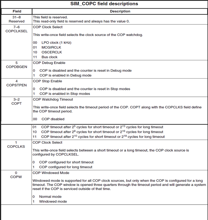 BIT2-3(COPT) : COPT 和 COPCLKS 欄位一起定義了 COP 超時時間,其中,BIT2-3=00 表示 COP 被禁用。BIT2-3=01 表示 2^5 個周期後將會觸發短超時或 2^13 個周期後觸髮長超時。BIT2-3=10 表示 2^8 個周期後將會觸發短超時或 2^16 個周期後觸髮長超時。BIT2-3=11 表示 2^10 個周期後將會觸發短超時或 2^18 個周期後觸髮長超時。