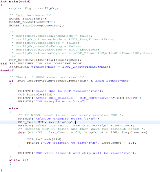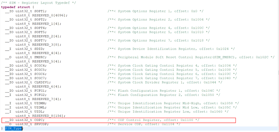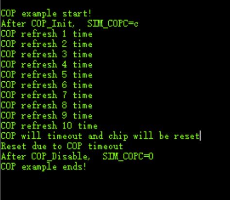 在任何復位之後,COP 看門狗都會被啟用。如果不需要在應用中再次使用 COP 看門狗,可以通過清除寄存器 SIM_COPC的[COPT] 位來禁用它。