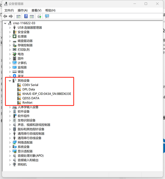 - 板子開機後插入電腦的USB口,在設備管理器中能識別出設備,說明USB通訊和板子正常,如下圖:
