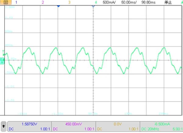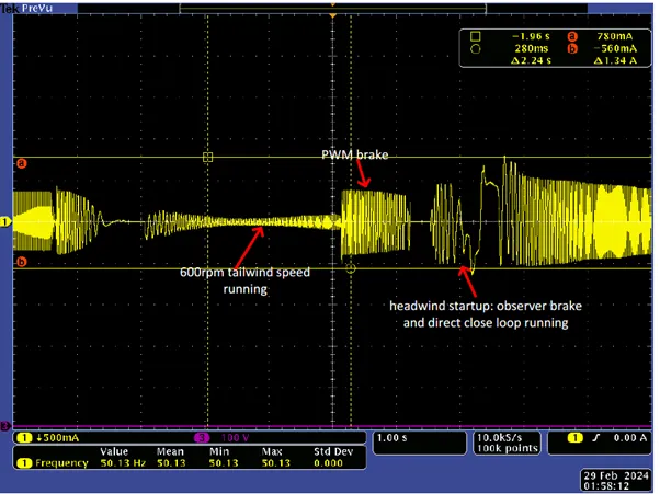 本方案採用載波頻率16KHz,支援速度、電流閉環控制,弱磁控制模式。非靜止啟動功能使吊扇即使在最初因外力而反向轉動時也能正常旋轉。方案還整合了多種保護,如硬體和軟體過流保護、過壓和欠壓保護,以及缺相和堵轉檢測。發生故障後,一旦故障被清除,系統將嘗試重新啟動並恢復到上一個速度狀態。演算法反應速度快,參數配置簡單,可直接閉環啟動。圖2為該方案的連接圖。圖3為正常運作的相電流波形圖。圖4為逆風啟動的相電流波形。