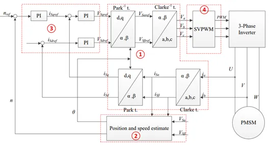FOC控制框圖如圖5所示,其中包括:①座標變換,包括Clarke/Park變換和Clare/Park逆變換②位置和速度估計演算法③PI控制,包括兩個電流(d/q軸電流)PI環路和一個速度PI環路④SVPWM模組。