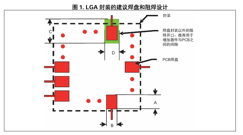 PCB焊盤和阻焊的一般建議如圖 1所示。請參考晶片數據手冊了解焊盤個數、尺寸和間距。