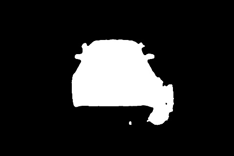 為了將路上的汽車和背景中的其它東西分辨出來,需要使用包含汽車的影像,搭配遮蓋汽車部分的遮罩進行訓練。以下左圖就是作為模型輸入的汽車影像,右圖是作為正確答案的遮罩。