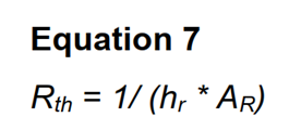 如前所述,輻射熱交換取決於波長、方向和溫度。然而,在實際應用中,通常使用近似值,特別是假定發射面完全漫反射(即輻射與方向無關),並且材料特性(吸收係數、反射和透射)與波長無關。對於熱輻射模式,熱阻可概括為公式7: