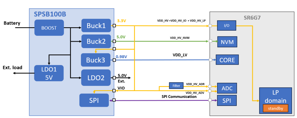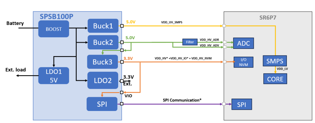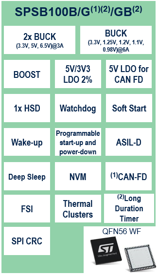 SPSB100是基於意法半導體最新一代BCD9sL工藝的車規級多功能電源管理系列產品,它集成多種強大的功能模塊,同時支持系統功能安全等級高達ASIL-D,符合客戶對於功能安全等級的最高需求。在多種汽車應用中動力域控、區域控制器、主驅逆變器、電池管理系統、車載電源等,SPSB100均可以靈活的滿足應用需求,以匹配這些應用中的所使用到的高性能微控制器。