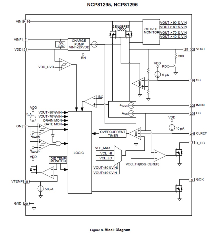 NCP81295及NCP81296 是一款高效能的熱插拔智能保險絲,專為4.4~18V電壓輸入的高電流輸出保護的應用設計。 它支持並聯使用以達到客戶大電流的應用如各種伺服器及存儲交換系統,並具有 過電流、短路偵測、過溫、軟啟動持續時間過長、閘極漏電保護,有助於整體輸入的保護作用。其5mm x 5mm LQFN32 封裝對於額定50安培來說還是相對較小及普遍 ,最常使用於12V輸入應用環境。此外,NCP81295是保護後鎖住狀態 ,而NCP81296是保護後自動重試 ,因應不同設計需求而選擇不同的功能。