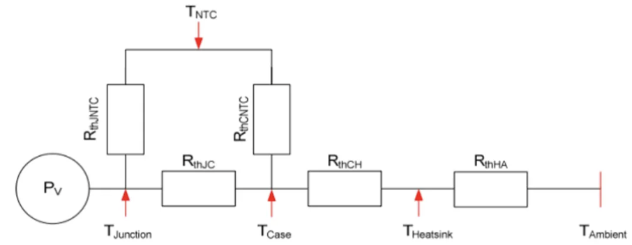 功率模塊的散熱通路由晶片、DCB、銅基板、散熱器和焊接層、導熱脂層串聯構成的。各層都有相應的熱阻,這些熱阻是串聯的,總熱阻等於各熱阻之和,這是因為熱量在傳遞過程中,需要依次克服每一個熱阻,所以總熱阻就是各熱阻的累積。