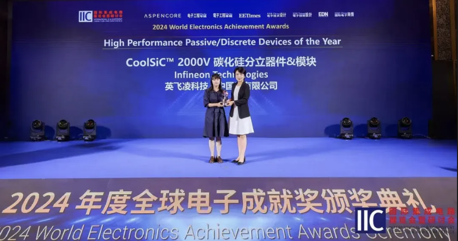 英飛凌科技CoolSiC™ MOSFET 2000V碳化矽分立器件以及碳化矽模塊(EasyPACK™ 3B封裝以及62mm封裝)憑藉其市場領先的產品設計以及卓越的性能,榮獲2024年全球電子成就獎(World Electronics Achievement Awards, WEAA)“年度高性能無源/分立器件”(High Performance Passive/Discrete Devices of the Year),再次展現了英飛凌在電力電子領域的技術創新能力和行業領先地位。英飛凌科技工業與基礎設施業務產品總監張明丹女士出席本次頒獎典禮。