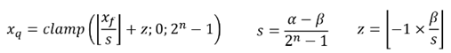 非對稱量化引入了零點(zero point)概念,使用縮放因子和零點兩個參數將浮點數映射到[0, 255]範圍。以下為其核心公式與示意圖,其中: z 是零點值、α 是最大值、β 是最小值、Xq 是量化後的值、Xf 是原始浮點數、s 是縮放因子。