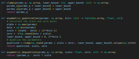 首先,一樣實現了三個核心功能:值域限制(clamp)、量化(quantization)和解量化(dequantization)。當我們輸入一組包含正負值的浮點數據時,比如最大值144.5和最小值-33.79,程式會計算出數據範圍(144.5減去-33.79),然後將其除以255(8位元的範圍)得到縮放因子0.699,同時計算出零點值48.0,這種設計確保了原始數據可以被完整地映射到[0, 255]的量化範圍內。可以看到最大值144.5被量化為255,解量化後變為144.73,誤差僅0.23,最小值-33.79量化為0,解量化後變為-33.56,誤差也僅0.23。最後,零值通過零點映射機制被量化為48,解量化後完美還原為0,且量化過程產生的均方誤差(MSE)僅為0.04,也展示了不錯的精度表現。
