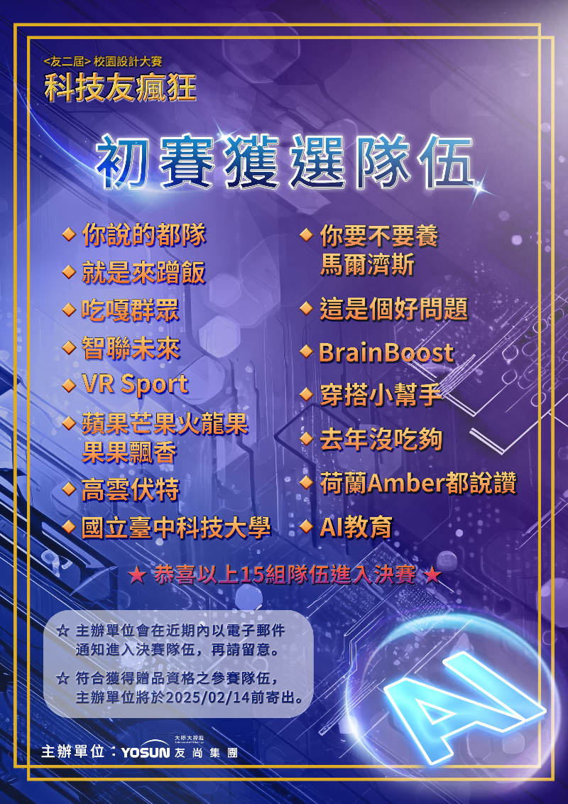 ★ 恭喜以下15組隊伍進入決賽,未得獎的團隊也不要灰心,符合贈品領取資格的參賽隊伍(附註一),我們將在2025/2/14(五)陸續寄出贈品,如2025/2/27(四)前尚未收到贈品,請與主辦單位聯繫(elaine_yao@yosungroup.com)。