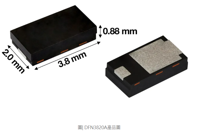 DFN3820A封裝的標準整流器,電壓範圍200V至600V,電流2A至4A。性能是SMP封裝的兩倍以上,在靜電幹擾方面超過15kV,適用於汽車、5G、工業等領域,包括整流、保護等。