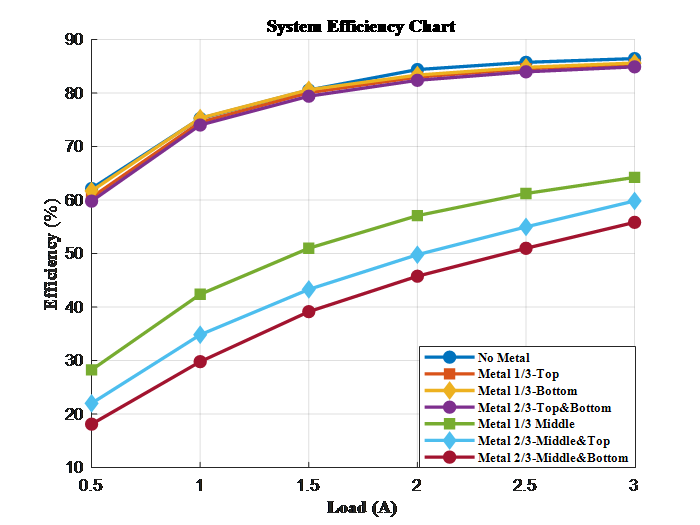 圖4、金屬異物在不同情境下對無線充電效率的變化