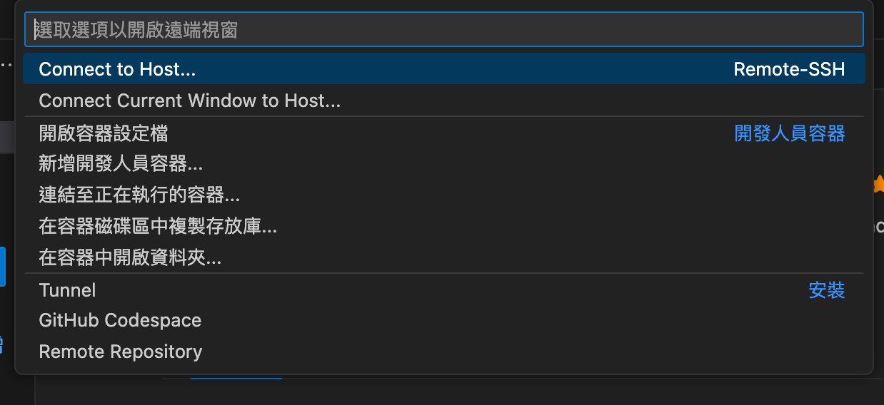 上方就會出線Connect to Host (Remote-SSH)選項,點選此選項:
