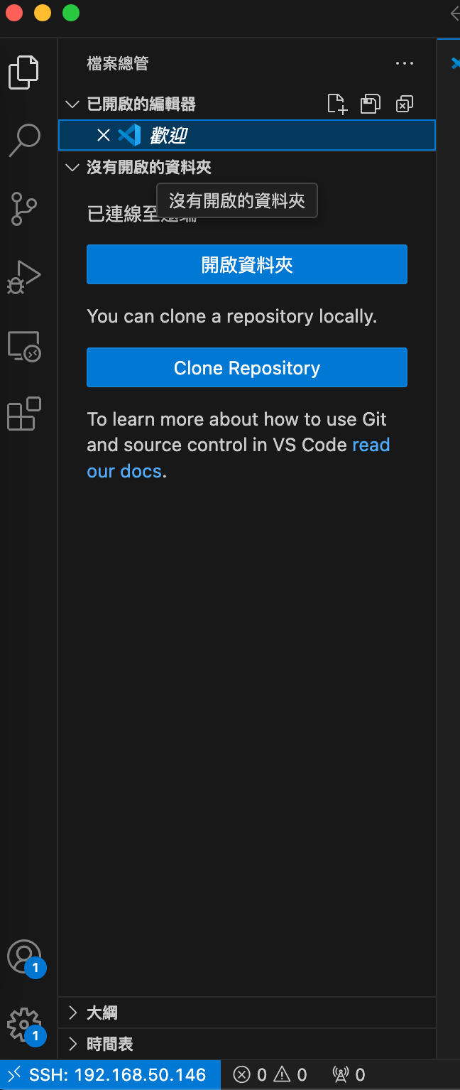 連接成功後,左下方就會顯示SSH:IP,接下來就可以從檔案->開啟你想要的檔案進行開發