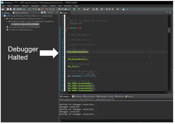 在建立 ST-LINK GDB 服務器連接並完成固件編程後,STM32CubeIDE 會切換至調試器視圖,並將調試器暫停在 main() 函數的入口處。