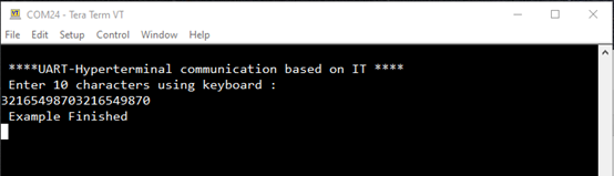 請參考項目的 readme.html 文件,該文件提供了所有必要信息。簡而言之,USART1 被配置為異步模式,使用的 GPIO 引腳為 PE5(USART1_TX)和 PE6(USART1_RX)。PE5 和 PE6 連接至 ST-LINK,後者充當虛擬 COM 埠(VCP)。應用程序會統計接收到的字節數,一旦收到 10 個字節,便會點亮 LED1 並輸出消息 [Example Finished]。