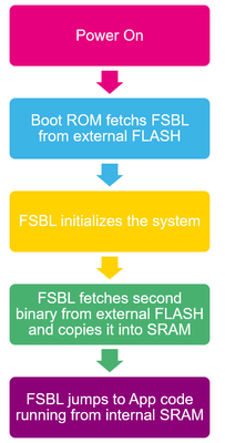 上電 → boot ROM 加載 FSBL → FSBL 從外部閃存加載第二份二進制文件到內部 SRAM → 跳轉至應用程序