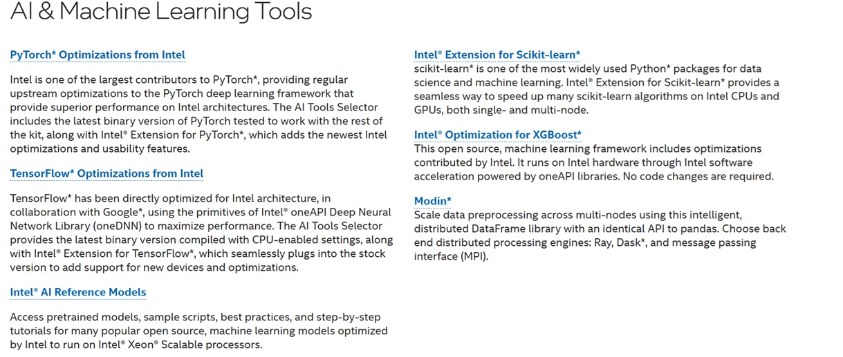 英特爾針對軟體開發人員發布了oneAPI 工具包,其提供新的跨基礎結構開發工具,並包含多種CPU和加速器最佳化,大幅加速機器學習運算