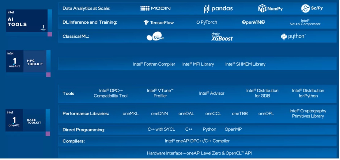 - oneAPI工具包中,包含了編譯器、效能函式庫、框架和各種分析除錯工具,供開發者用來建置、分析和最佳化,運作在CPU和GPU之上的高效能跨基礎架構應用程式。oneAPI跨基礎架構的開發模型,提供開發者一些工具,以加快建構跨架構應用程式。