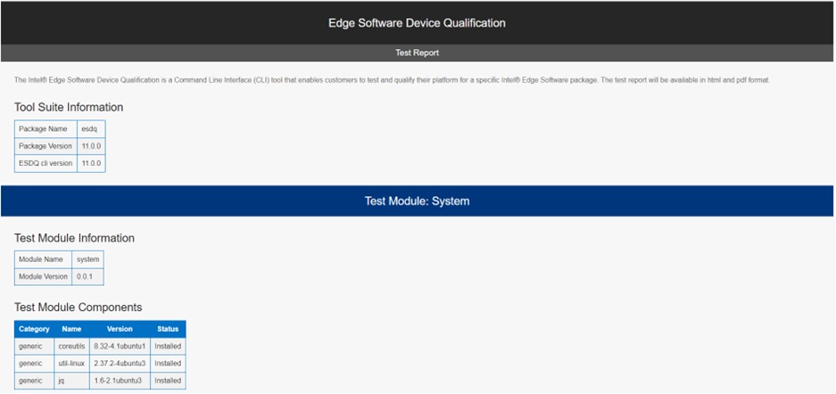 英特爾® ESQ 軟體包附帶命令列介面 (CLI) 工具。它為客戶提供在目標系統上運行英特爾提供的測試套件的能力,目的是使客戶能夠針對特定的英特爾® Edge 軟體包測試他們的平台。