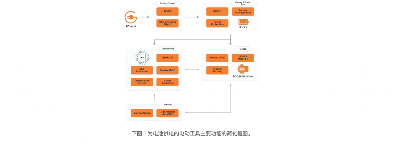 下圖 1 為電池供電的電動工具主要功能的簡化框圖。