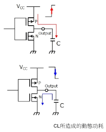 設輸出訊號頻率為fOUT(=1/TOUT),則平均電流(IL)表示為:IL=QL/T=CL×VCC×fOUT;因此,動態耗電量(PL)為:PL=VCC×IL= CL×VCC²×fOUT;