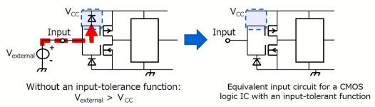 A: 在輸入側插入二極體以進行ESD防護。如果施加的電壓高於VCC或在IC關閉時施加電壓,則輸入端和電源之間的二極體可能會導通。IC可能會被產生的大電流破壞。因此,透過使用具有輸入容限功能的IC,即輸入端和電源之間無二極體的IC,可以防止裝置損壞。