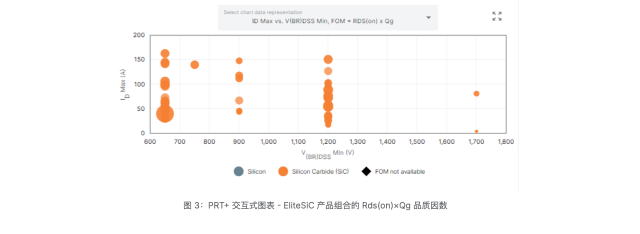為簡化器件搜索,PRT+ 工具整合了各種先進功能。交互式圖表便是其中之一,能夠以圖形方式直觀呈現產品組合的各種參數。下方例子為 EliteSiC 產品組合的 Rds(on) 品質因數 (FoM)。