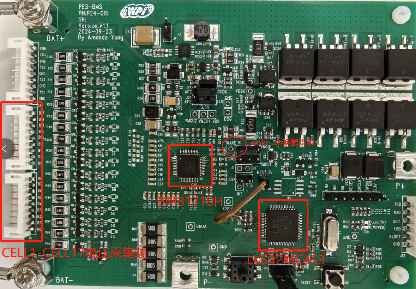 如圖1所示為LKS32MC453 MCU 搭載 AFE BM81710H實物板,如圖中紅框裡從左到右所示分別為:CELL1-CELL17電壓採集端、BM81710H晶片、wake up喚醒引腳,LKS32MC453 MCU。