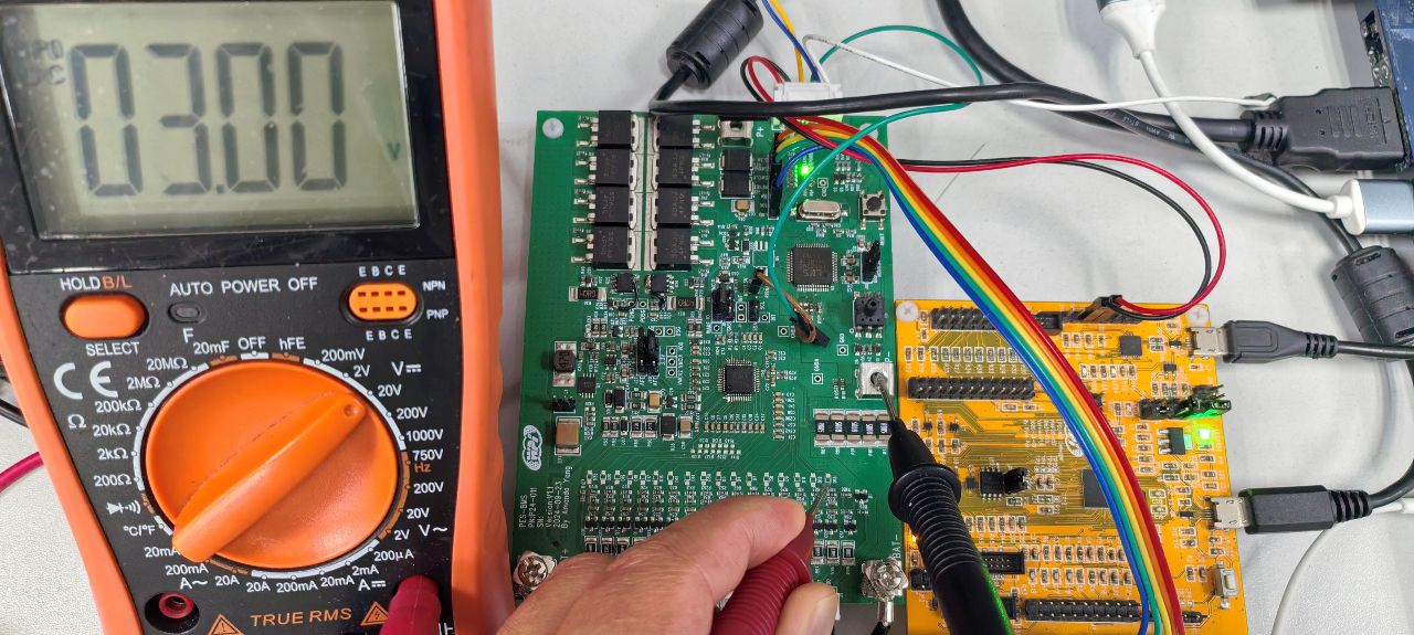 首先在 CELL1-CELL17 電壓採集端依次連接 17 串3.0V 的電池,用萬用表依次在每個 CELL 端量取電壓值均是 3.0V,如下圖所示,綠色板為 LKS32MC453 MCU 搭載 AFE BM81710H實物板,黃色板為 SWD 程序燒錄板。硬體連接好,接下來燒錄程序,程序實現 MCU 使能 wake up 引腳高電平,喚醒 BM81710H,等待 70ms 使 BM81710H 內部系統穩定,與 BM81710H 進行 I2C 通訊,調用電壓獲取函數實現 CELL1-CELL17 電池電壓的獲取,並將獲取的電壓值通過 UART 列印到 UART 串口助手上。