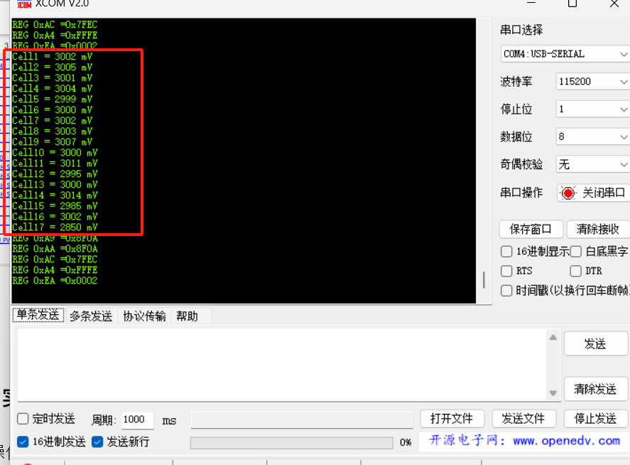 4.2 串口助手接收到CELL1-CELL17 的電壓值: