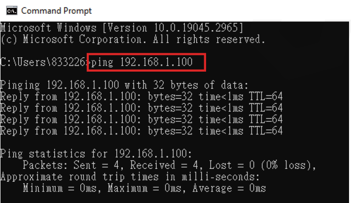 05. 電腦端 開啟"命令提示字元(cmd)"並 ping 全景攝影機的 IP,以檢查該 IP 是否可存取。