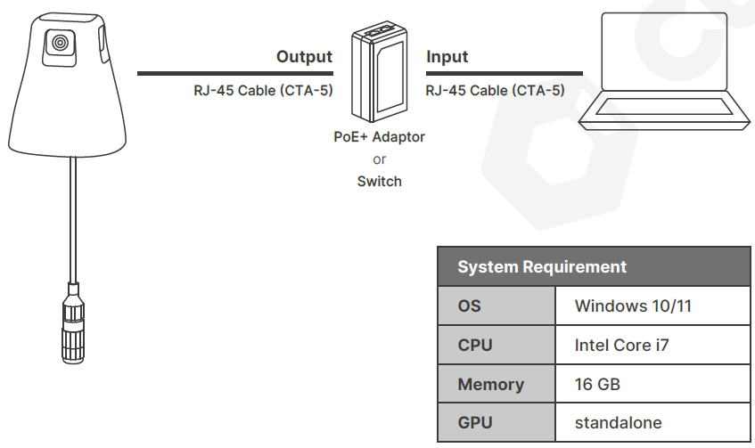 01. 使用 RJ45 CAT6 網路線 將全景攝影機 連接到 PoE+ 的交換器(Switch)/注入器(Injector)。