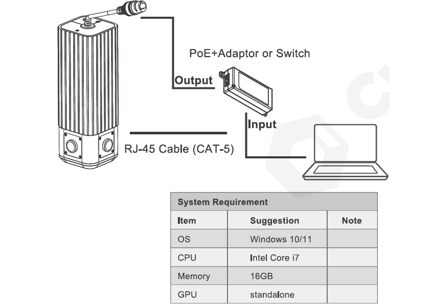 01. 使用 RJ45 CAT6 網路線 將全景攝影機 連接到 PoE+ 的交換器(Switch)/注入器(injector)。
