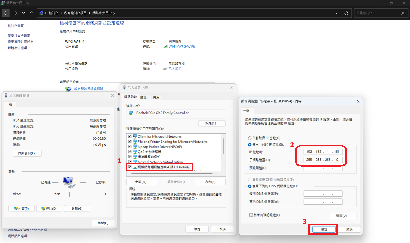 03. 將 電腦 的乙太網路 配置設定 與 全景攝影機 為同一網段。如下圖