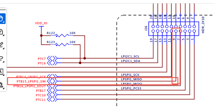 我們使用D12引腳控制LED,根據原理圖可知D12與開發板PTB15相連接。