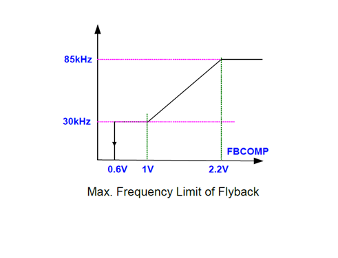 LD7791使用最大頻率限制控制反激開關頻率的方案,取決於FBCOMP電壓的水平。當輸出負載減少,FBCOMP電壓變低光照下開關頻率可以降低負載狀況。此功能有助於增強輕載條件下的效率。為了滿足歐洲「EMC指令」的要求,有必要採用具有PFC控制的解決方案。為了提高輕載下的效率,LD7791具有 PFC 控制功能,能夠關閉切換到降低功耗。隨著 FBCOPM 電壓下降低於 PFC ON/OFF 電壓閾值時,PFC 控制器將停止 PFCDRIVER 開關,直到 FBCOMP 電壓恢復其水準。