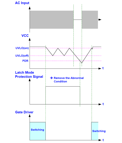 LD7791由於閂鎖型保護電路會鎖存操作,即使 VCC達到 UVLO(ON)系統無法恢復除非重新供電,讓 VCC 降至斷電重設 (PDR),然後斜坡超過 UVLO(ON)。