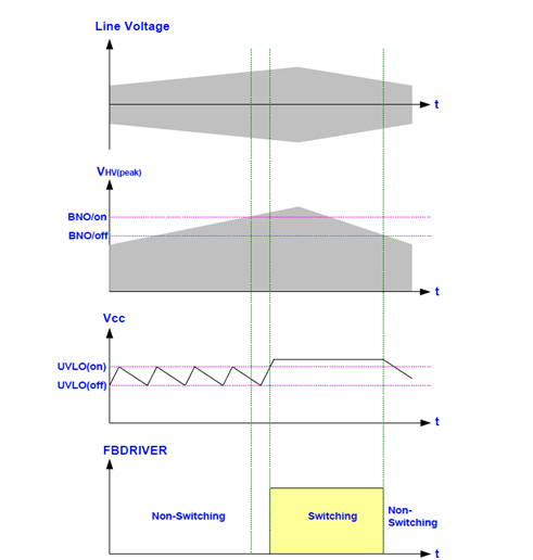 當VHV<HVBO時,柵極輸出將保持關閉當VCC已經達到UVLO(打開)時,此時強制VCC在UVLO(打開)和UVLO(關閉),除非線路電壓高於HVBI VAC,即使在下一個開關打開時,門輸出也不會開始切換UVLO(開啟)跳閘。實現了一個遲滯,以防止在接通和斷開期間錯誤觸發。