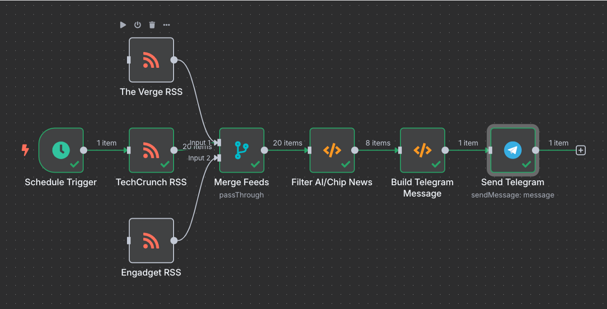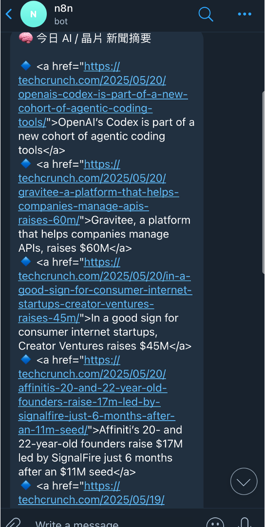"functionCode": "let message = '今日 AI / 晶片新聞摘要\\n\\n';\nfor (const item of items) {\n const title = item.json.title;\n const link = item.json.link;\n message += `<a href=\"${link}\">${title}</a>\\n`;\n}\nif (items.length === 0) {\n message = '今日沒有關於 AI 或晶片的科技新聞。';\n}\nreturn [{ json: { message } }];"