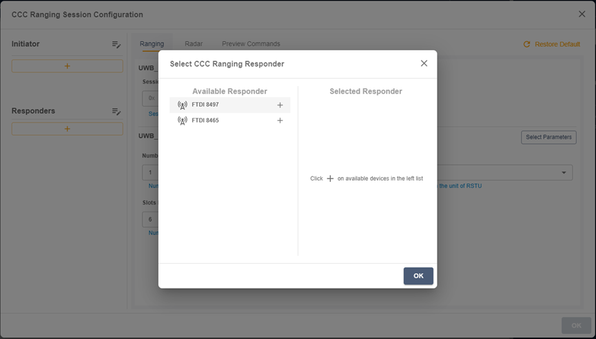 5. 選取FTDI8465點選[+],將其EVB設定為Responder, 另選取FTDI8497點選[+],將其EVB設定為Initiator。設定完全後即可看到兩個EVB個別設定的模式。